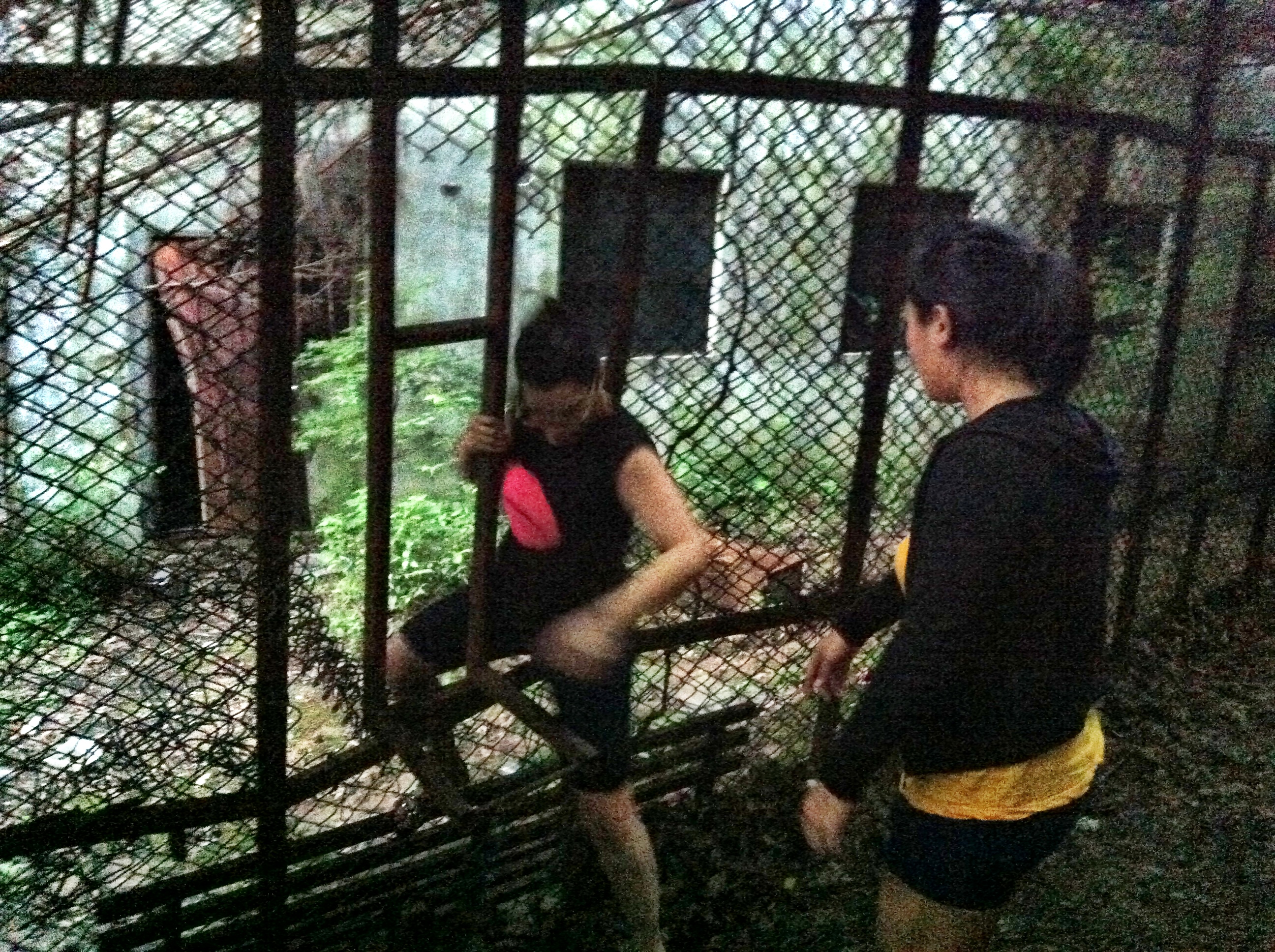 We ended up getting out a much easier way than we got in. We went out this door that was thrust open from the bottom up, saw where a massive tree had fallen and brought the whole structure down with it, and then shimmied ourselves out between some rusty bars. Cue second mini panic attack as I thought the bench we had to step on was going to fall forward as I stepped.