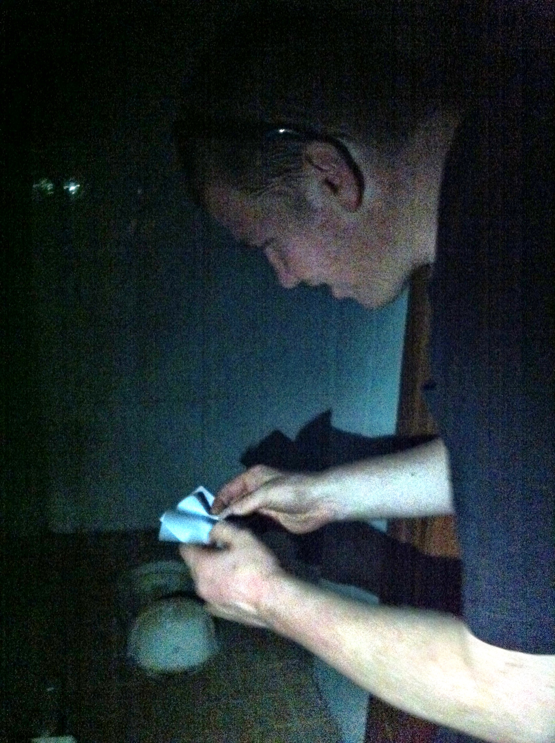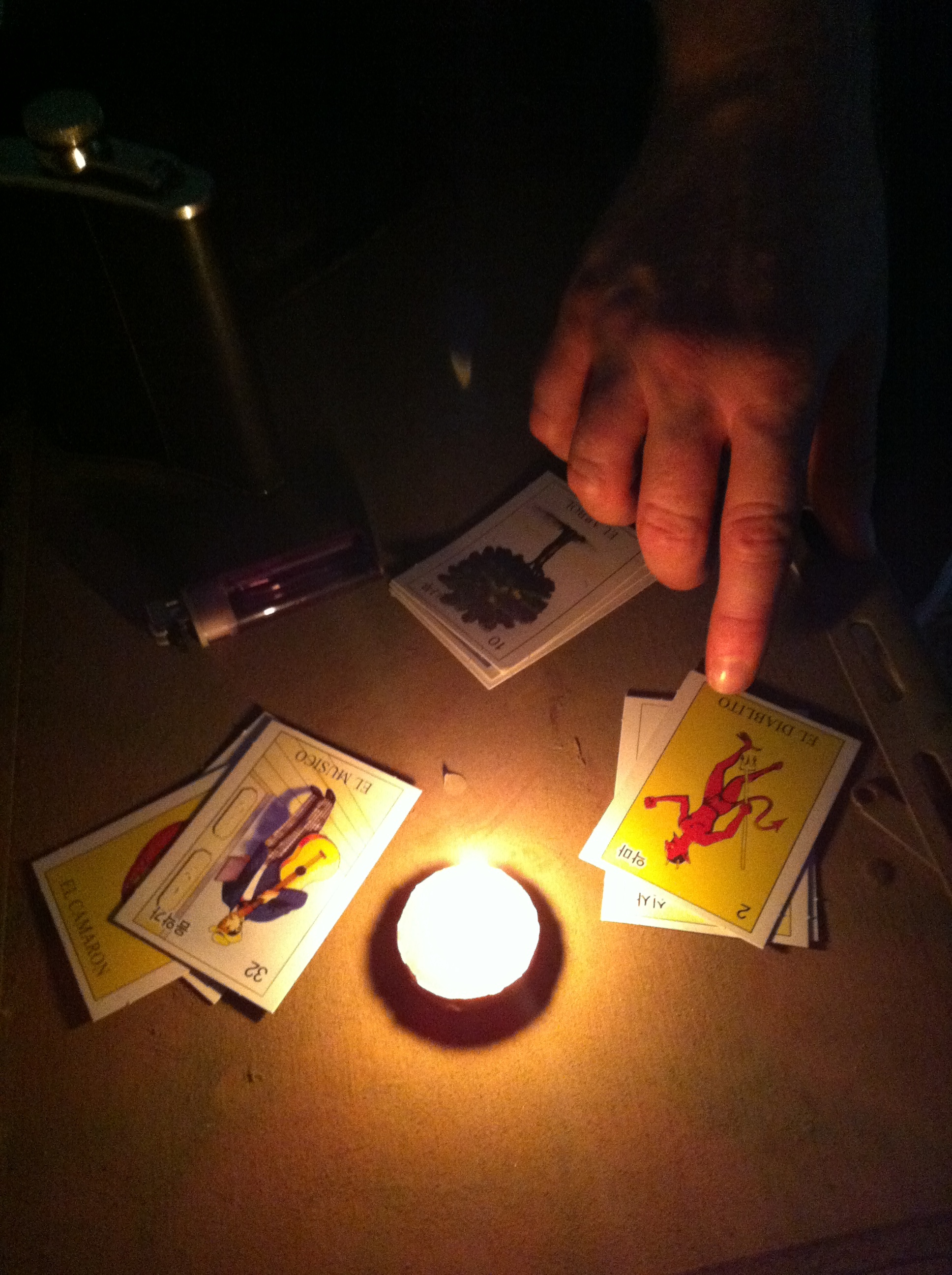 After coming down, we went back into the “KILL ROOM” for a seance of sorts. Remember those Spanish Tarot cards and candle Joshua brought with him in his mom bag? Well, our fortune teller took those out, handed out props and had us pick our fates in card form. With a swig of whiskey, a light of the candle and a knife through Jee’s head, fortunes were told. Looks like Jee will be getting a visit from the Devil and/or a douche bag disguised as a gentleman. Or so the spirits told him.