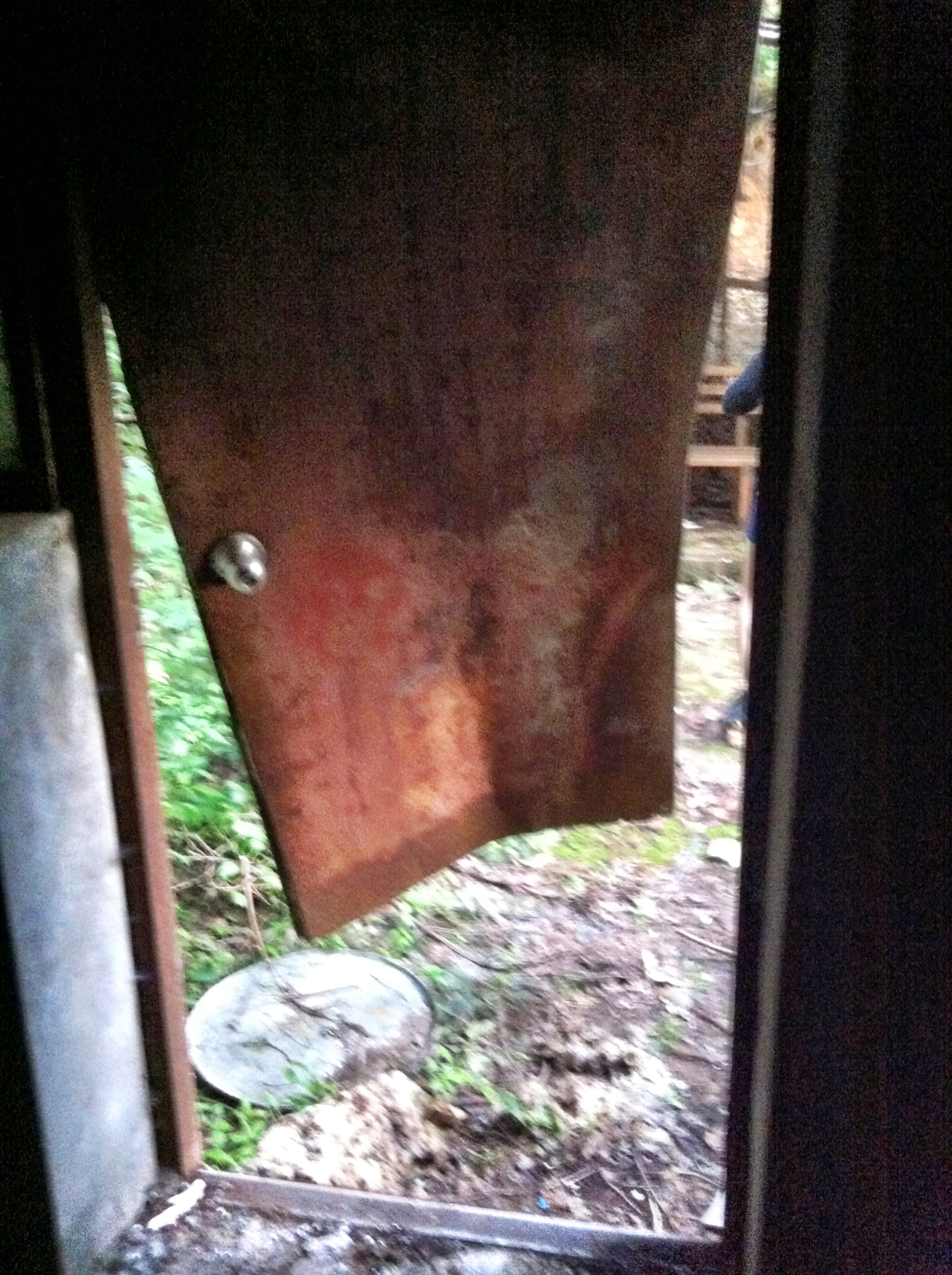 This ended up being the way we broke in, but for now we decided to put a hold on that way of entry and scope out the rest of the building for an easier way in. We found a window on the lower left side that we climbed through. We scoured past moldy chairs and glass to go up a flight of stairs, only to find that it was shut tight.