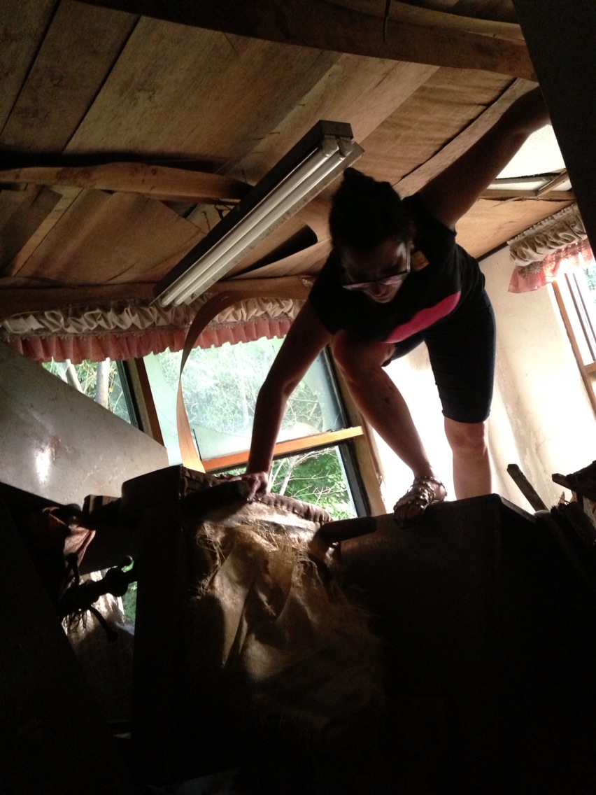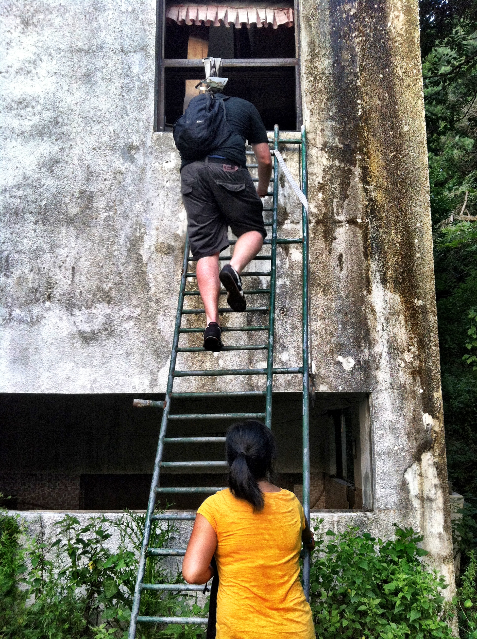 To the right of the main staircase, there’s a wide green ladder perched to one of the top windows. This ladder is secured in place by nothing but what appeared to be a heavy duty airplane seat belt, or belt used to buckle crazy people to their beds. When Josh took the lead to try and climb in, he got a little freaked and thought it was going to fall or break, or that we’d contract some disease from the rust and dripping something coming down from the window.
