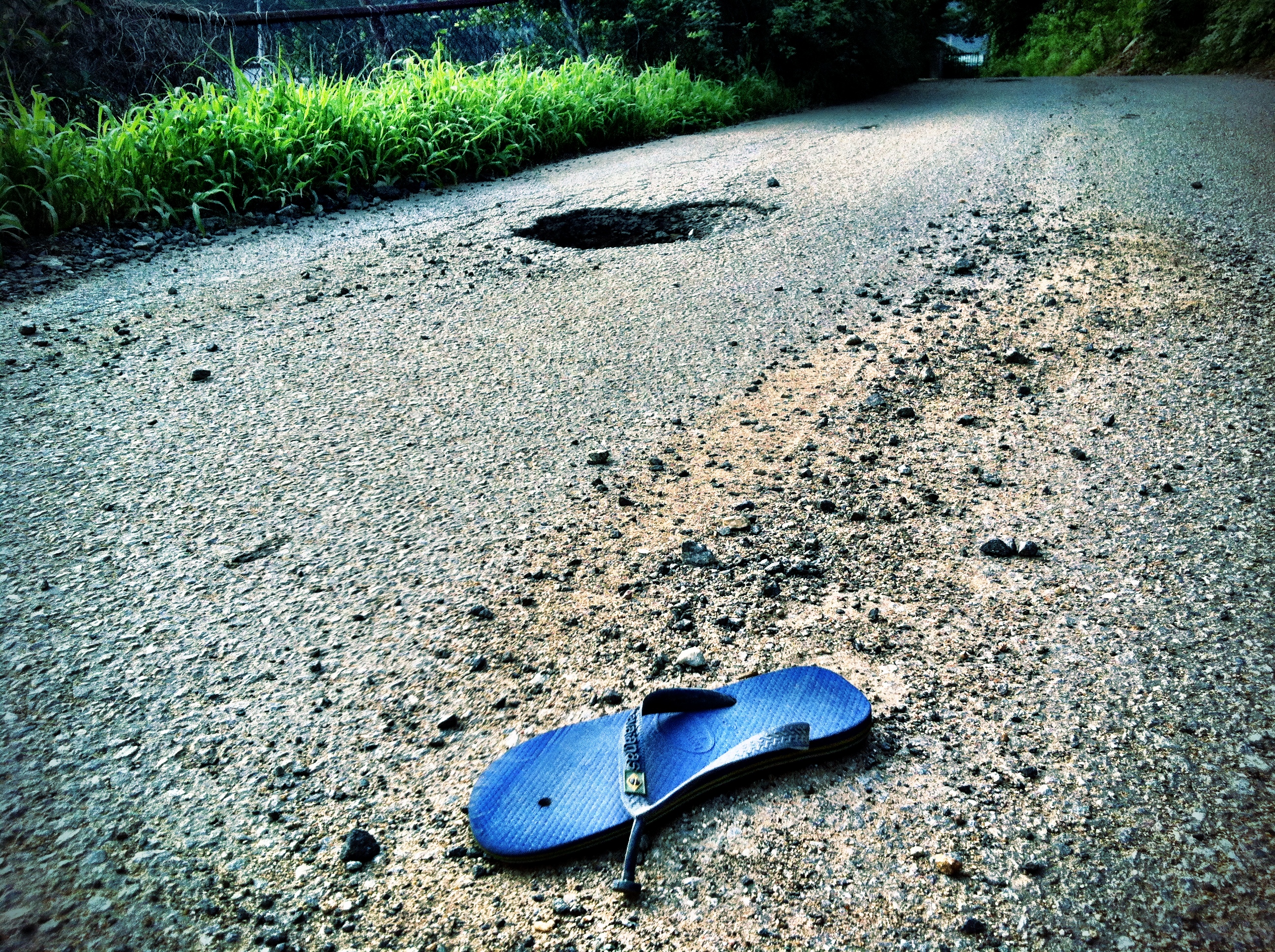 After jumping out of the car, not forgetting Josh’s mom backpack fully equipped with the necessities: whisky, candle, bloody props and tarot cards, we came face to face with our first creepy sight of the afternoon. Looks like somebody was sent running for their life and poor Havaianas got left behind.