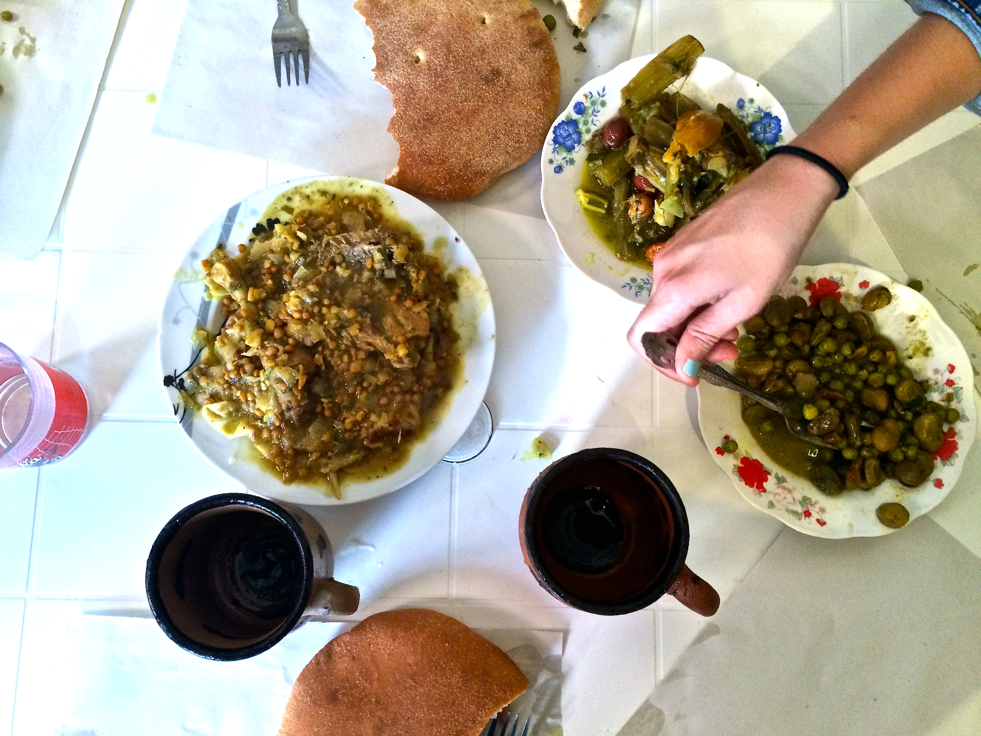 We ate chicken Rfissa with lentils, chickpeas with greens, Auburgine fritters, fresh bread, and drank water out of the smelliest communal table mugs. Amazing.