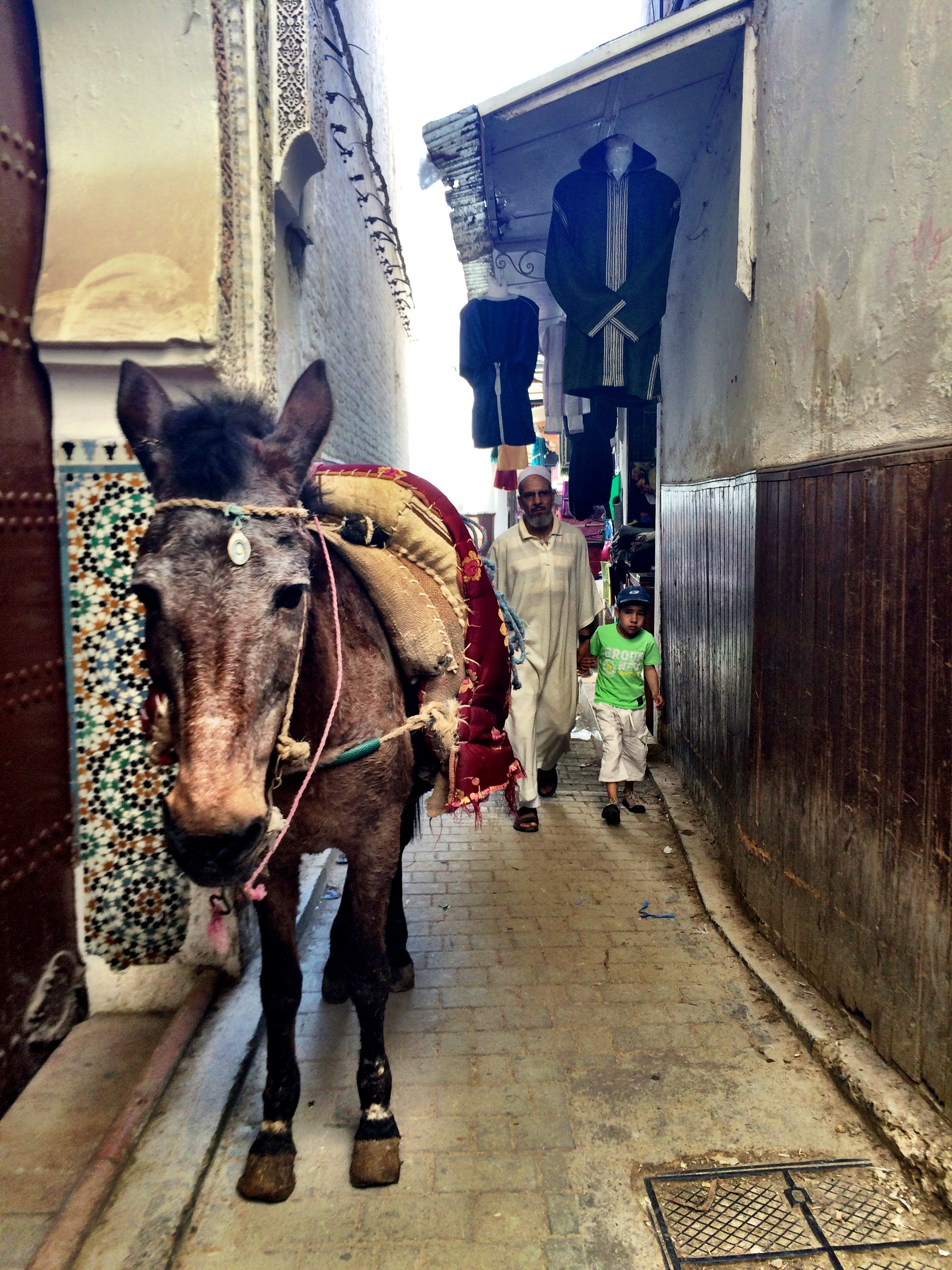 With a slammed morning behind us, we headed back to the Riad to fetch our bags. We made our way through the souk, which was an entirely different type of souk than that of Marrakech. People in Fez use the souk for everyday life things. It’s where you go to buy your wedding gown, your meat for tonight’s meal, your bath oils and your handmade rugs, and to maybe see the head of a beheaded camel. It’s not so much a place to find your chachkies to take home like the souks in Marrakech.