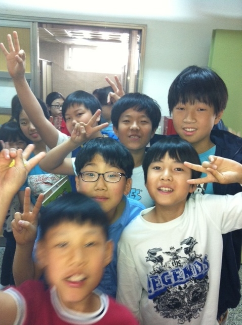 Wawa and about 10 pounds of candy came to school with me 2 days of the week, so she helped teach and squeeze the cheeks of my 3rd and 4th graders with me and Jin.  My classroom is also on the 6th grade floor, and since she didn’t come to class on days I taught them or 5th graders, they could only get candy if they asked Wanda a question.  Most of them asked the same shit, “What’s your name?” “How old are you?” “Where are you from?” and just dug their dirty hands into the bag of candy, but then they had to actually ask her good questions.  Especially the smart ones. I made them. Some were actually good “Who’s your favorite Hollywood star?” and of course “Do you have a boyfriend? No? Why not?” Our favorite question EVER. Both days that she was here this is what it looked like just outside my classroom.  I had to play zookeeper to a bunch of candy crack babies  a couple times. That was fun.