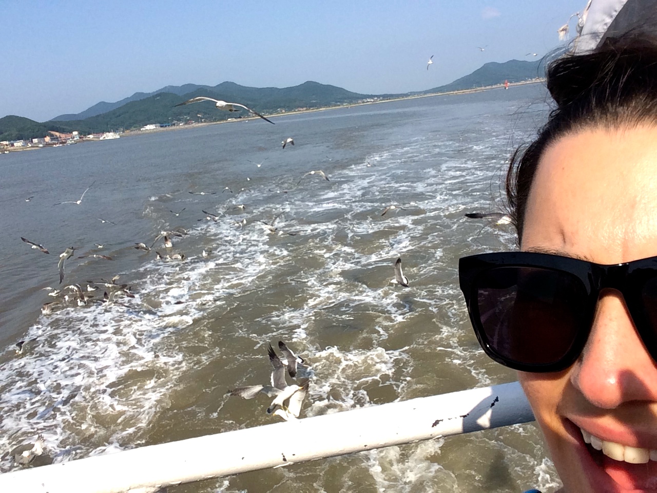 The bus to get to the port took FOR-EVER. Many people take their cars over to Seokmo-do, so the traffic was horrendous. What would typically be a 35-40 minute bus ride took over an hour, at which point I hopped off and walked the rest of the way to the port. When I got to the port there were tons of little shops selling shrimp chips and special ginseng makkoli. A specialty of the island is their dried shrimp, and the seagulls that follow the boat over to Seokmo-do are very greedy when it comes to those shrimp chips!