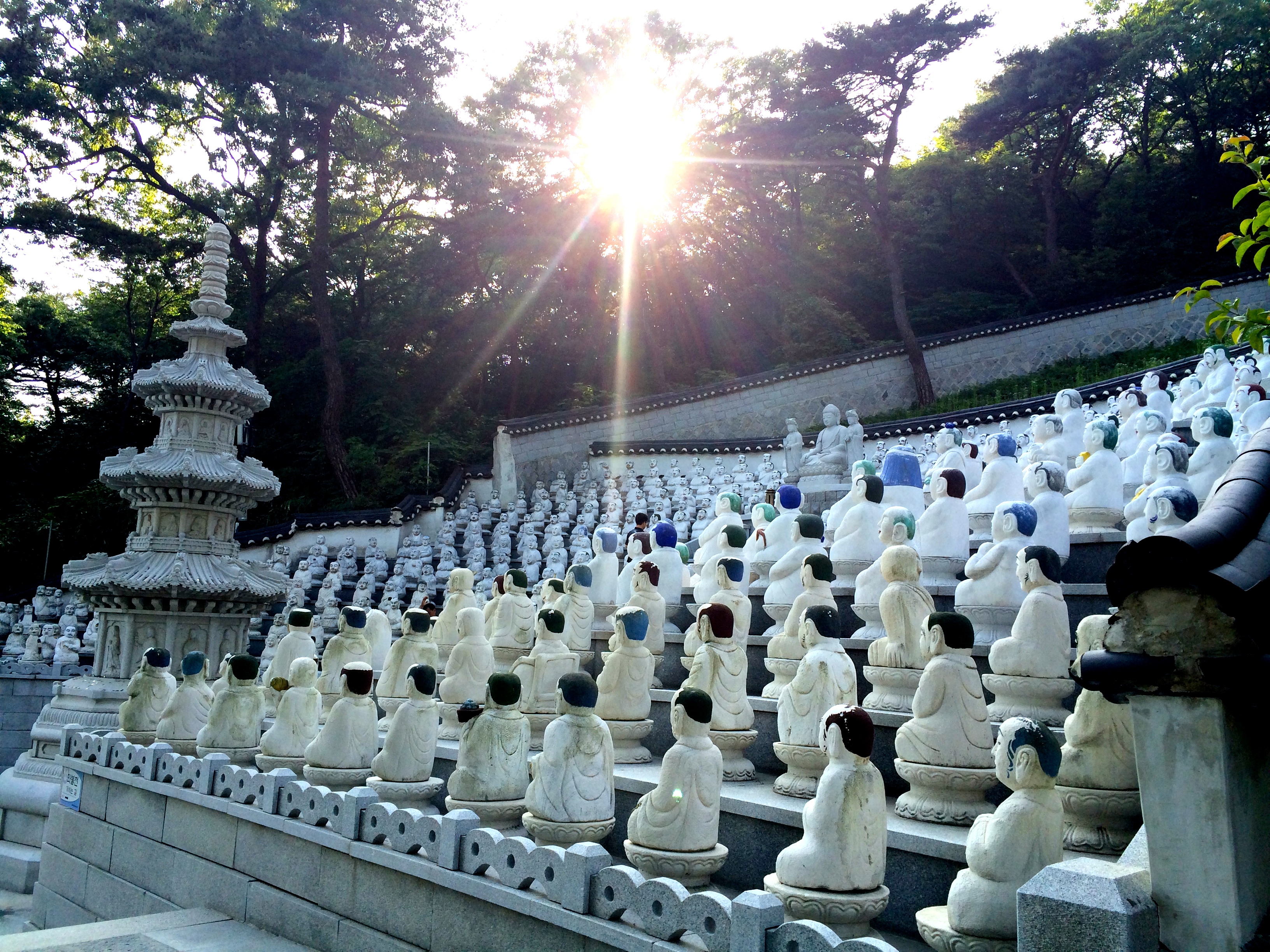 What I wanted to see most at Bomunsa were the hundreds of Buddhas! Just as you arrive to the top of the hill to your left is a procession of all these white Buddhas with different faces and expressions. I saw a bunch of people also throwing coins to the big statue in the center, so I’m thinking that’s to make a wish or pray or something.