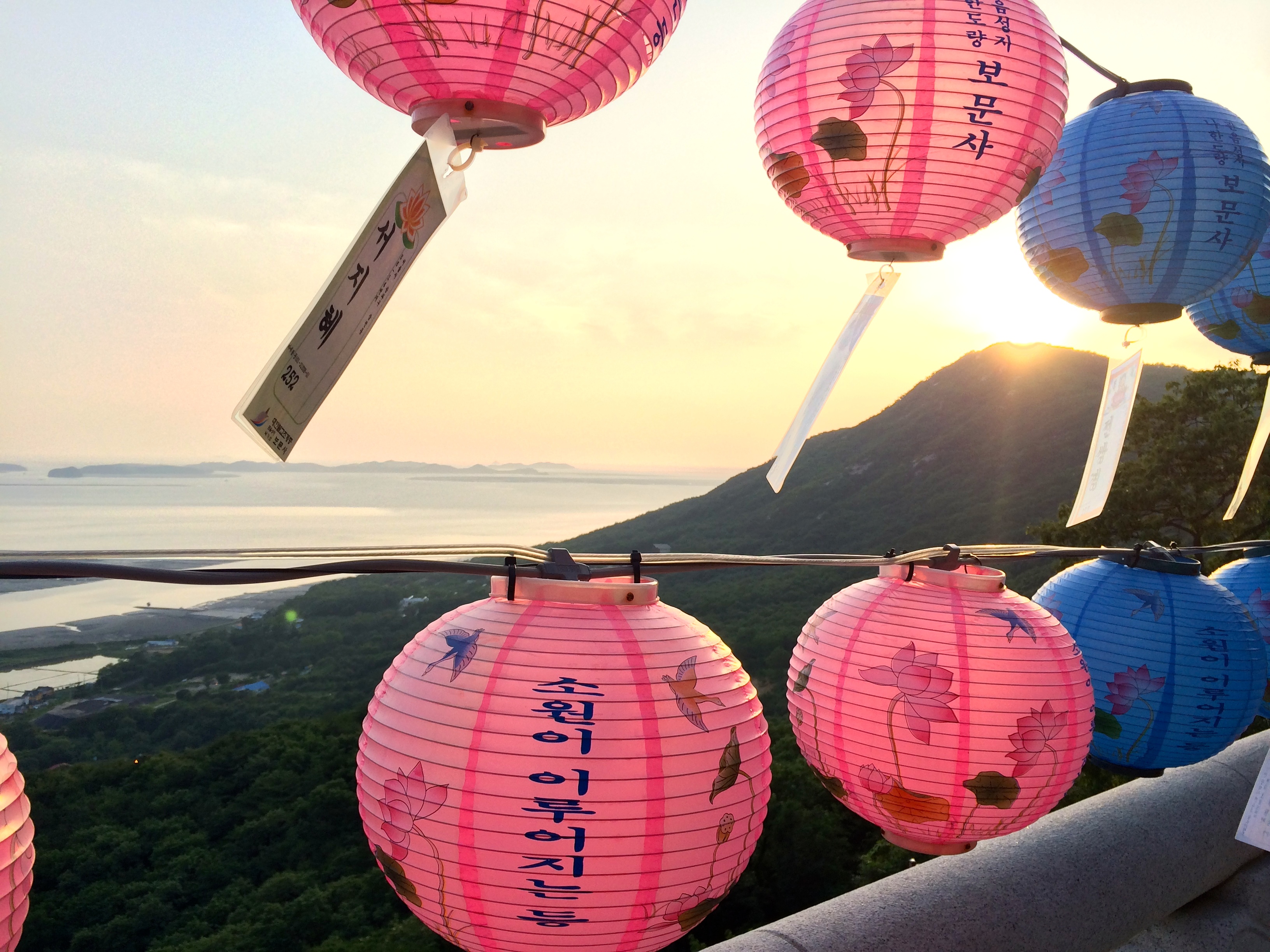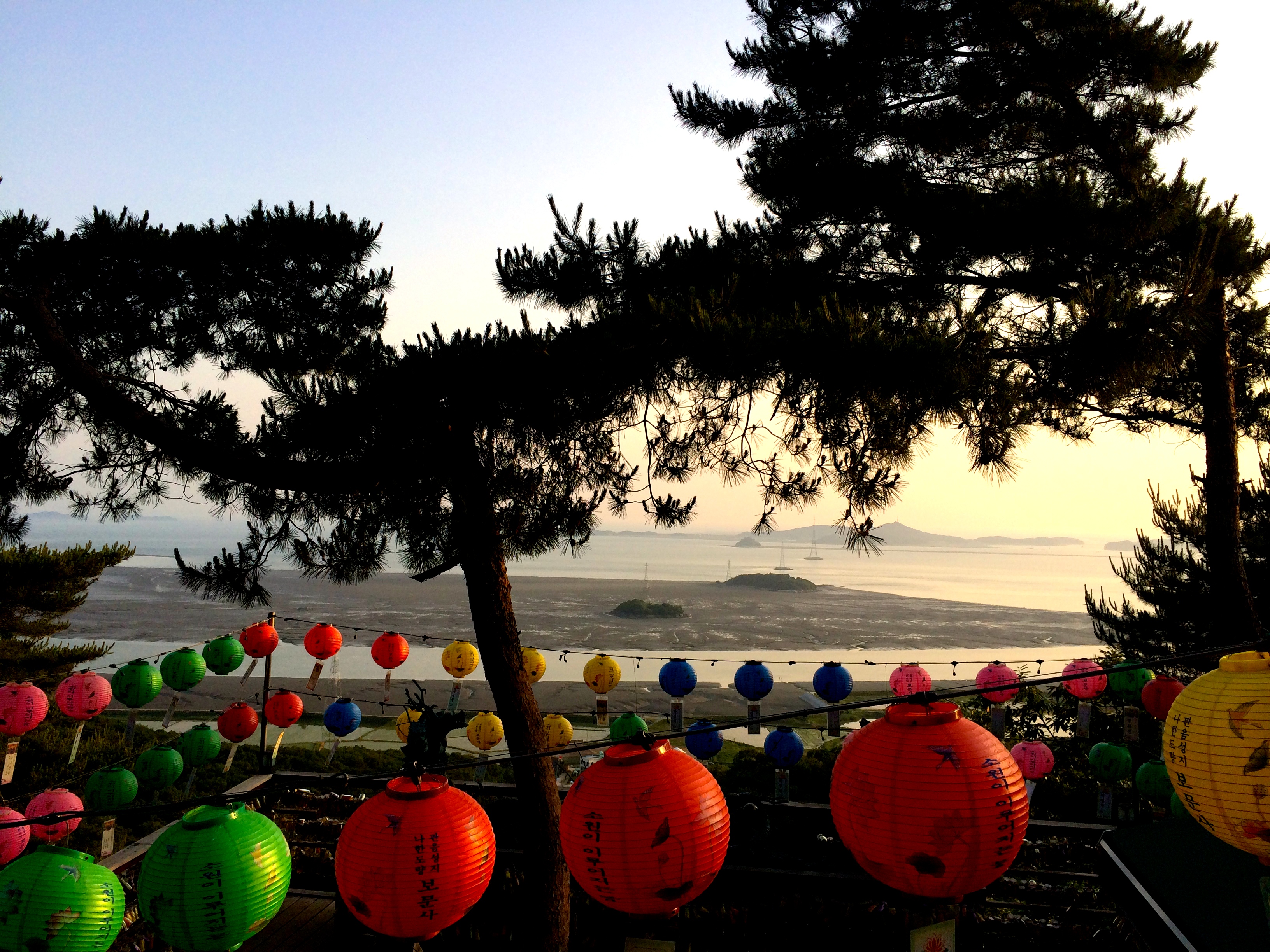 See that flight of stairs to the right? That leads all the way up to the top of that mountain, where there resides a Buddha carved into the side of the mountain. People who were there on a weekend temple stay were doing their daily prayers with the sea breezing behind them.