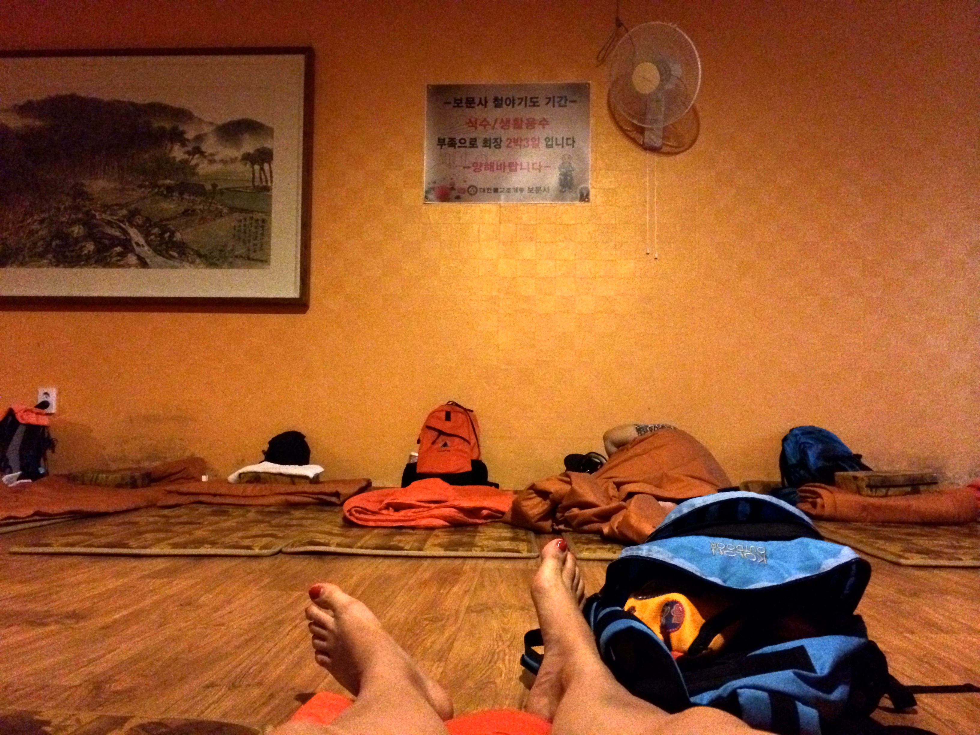 For my slumber, I was given a mat, blanket and a rectangular pillow that I laid out in the middle of a bunch of ajummas for the night. As the only foreigner, I was quite the attraction amongst these women. There were two sisters that I was sleeping next to, and they showered me with Korean melon, candies and ddeok for days. Through my broken Korean and their broken English, we established that one of the sisters has 2 granddaughters that are half whities and were born in America. She then proceeded to call her granddaughters to have them translate all the burning questions she had for me. She even asked if she could come to my house because “she wants to see how I live.” I had a good laugh about that one with her 7 year old granddaughter, Grace.